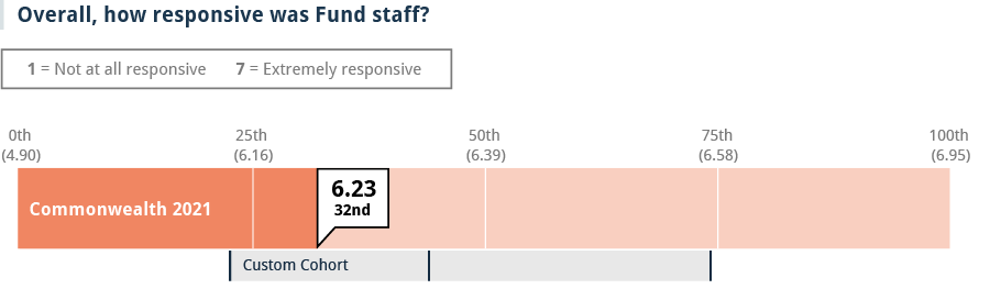 Responsiveness and clearer communication around goals and strategy. Grantees rated the Fund lower than peer foundations on measures related to responsiveness and providing clear and consistent communication about goals and program strategies.